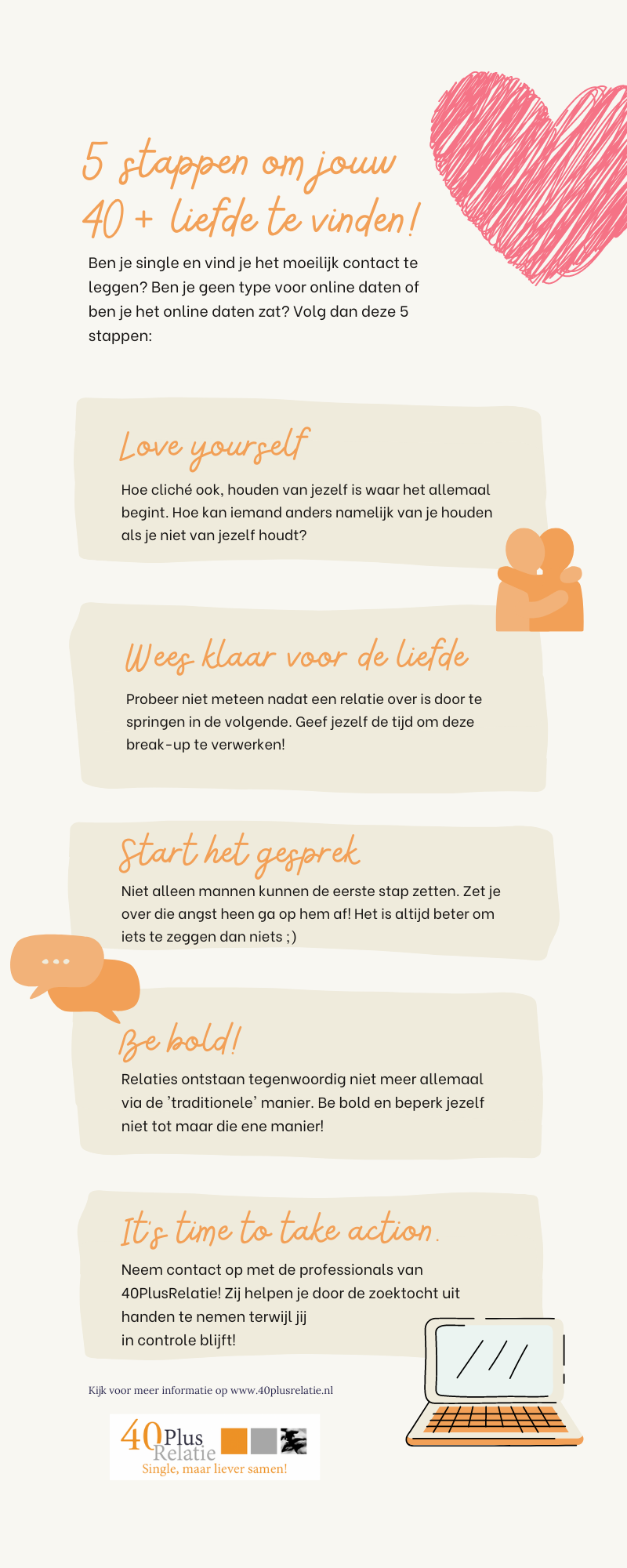 Ben je single en vind je het moeilijk om contact te leggen? Ben je geen type voor online daten of ben je het online daten zat? Pak het eens anders aan! Onderstaande 5 stappen helpen je naar jouw 40+ liefde: