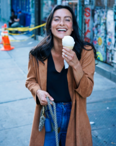 Er gebeurt veel in de foto en dat maakt het juist zo interessant. De foto is genomen op straat (in de realiteit) terwijl ze haar hond uitlaat. Ze geniet van een ijsje en lacht spontaan naar de camera.
